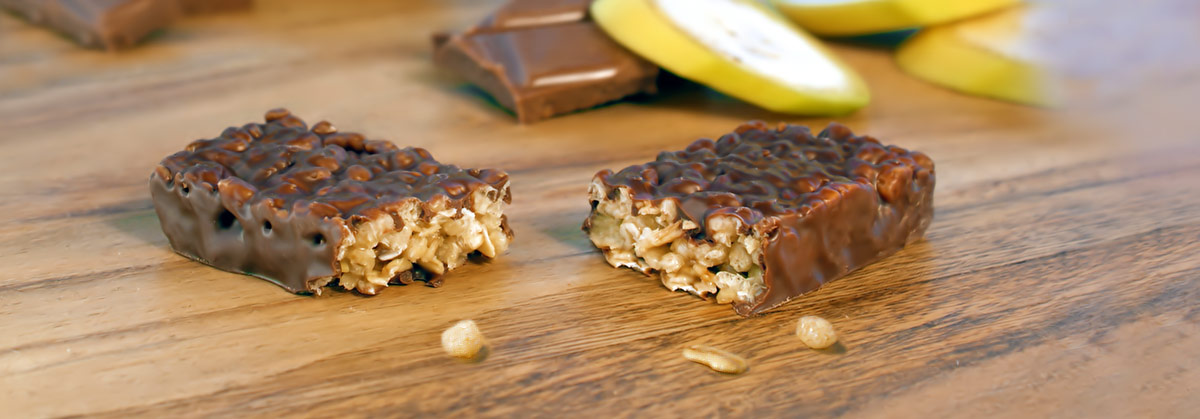 Produktbeschreibung: Müsliriegel mit einem Überzug aus Milchschokolade (und Bananenstücken) Alternativen: Überzug aus Bitterschokolade, verschiedene Frucht- und Nusssorten
